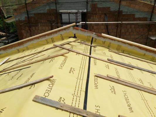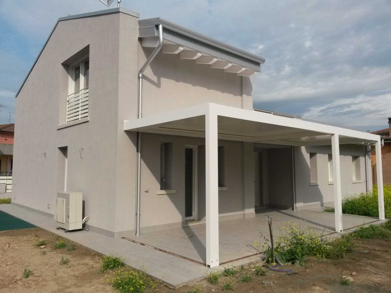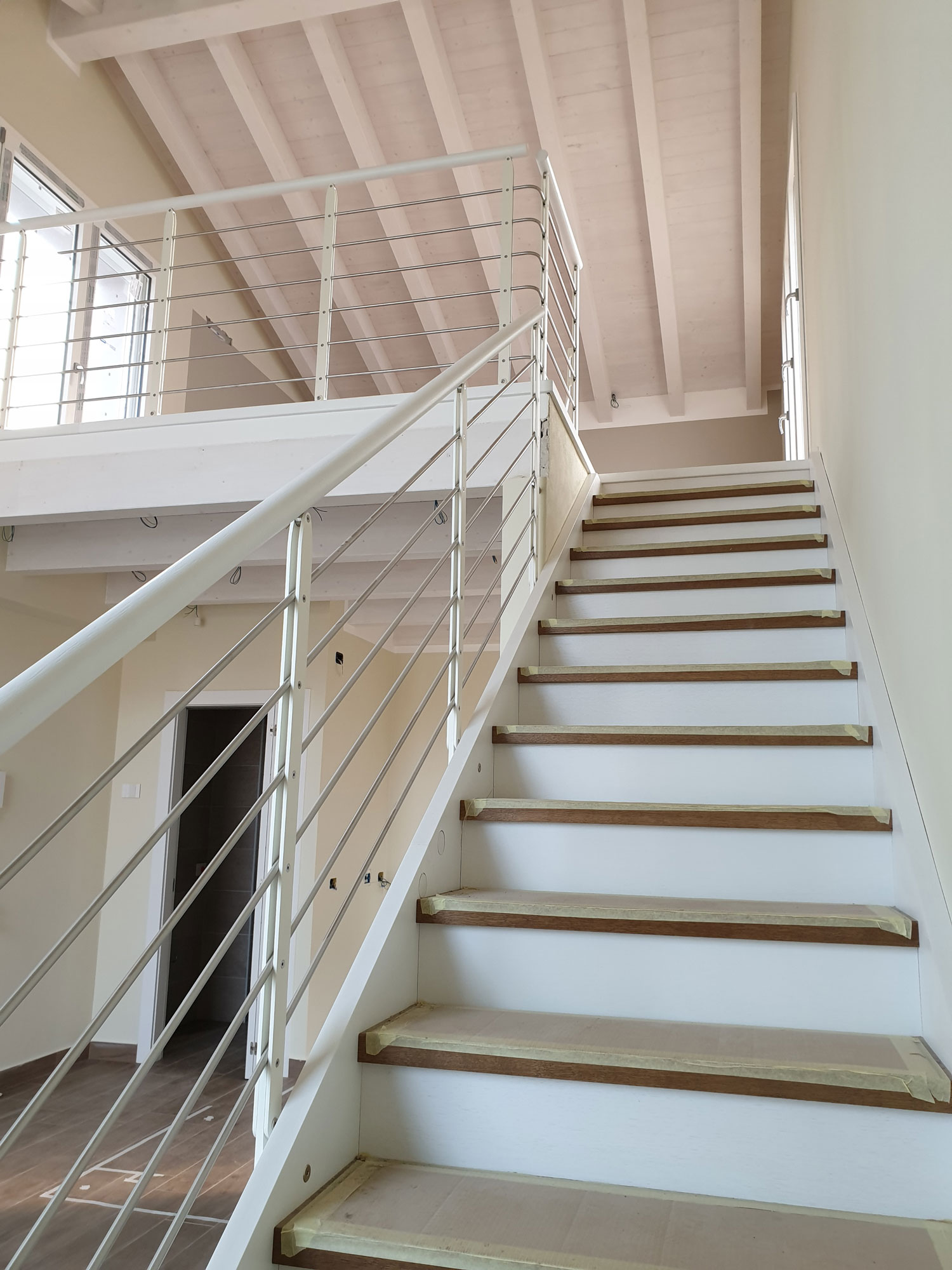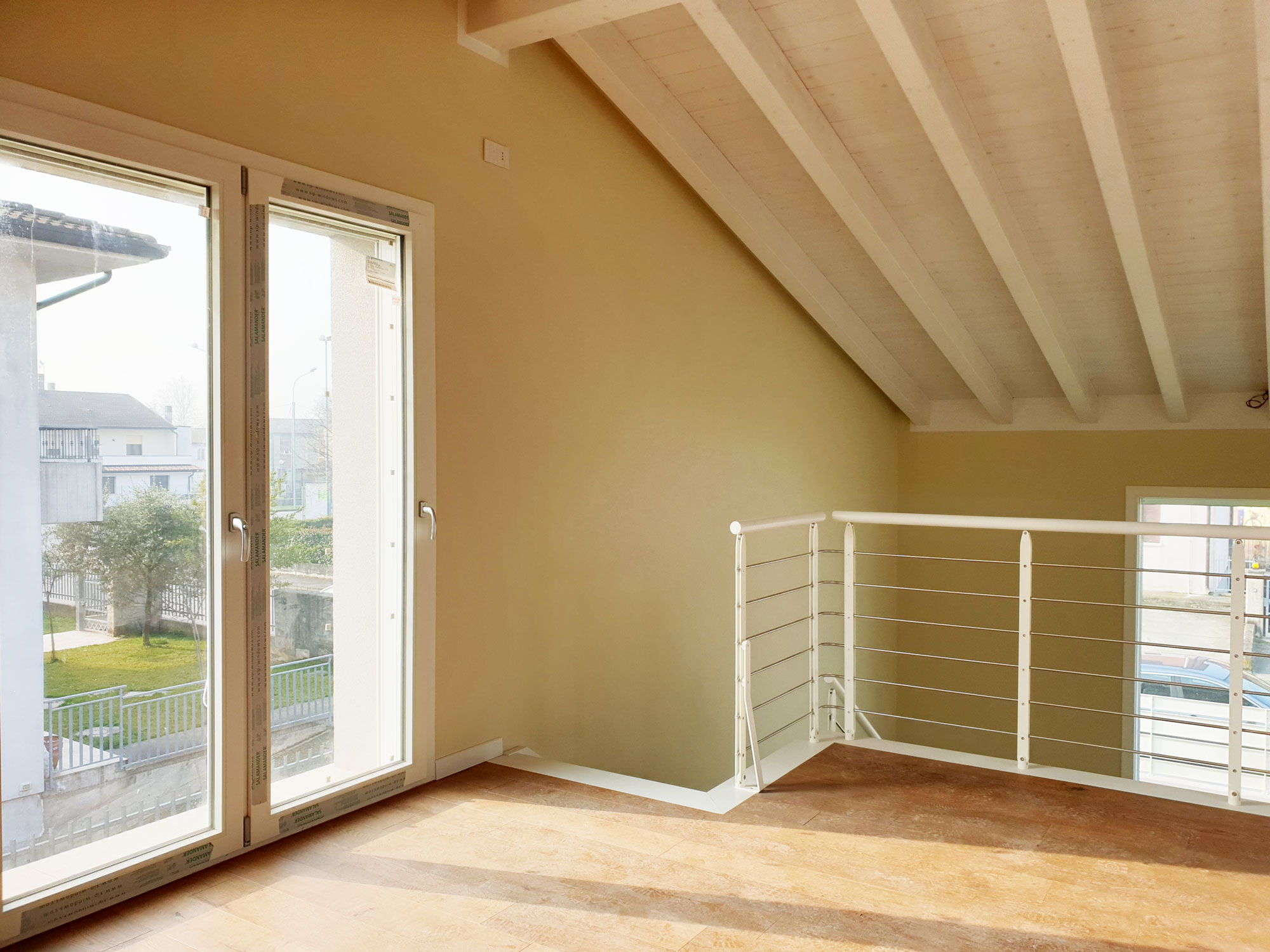 I due volumi più esterni, infatti, sono racchiusi superiormente da una copertura con rivestimento in lamiera aggraffata, mentre il volume del nucleo centrale culmina con una terrazza, accessibile dal soppalco che da sulla zona giorno.